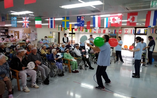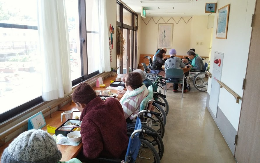 | 誕生日会 いつものホールではなく4階の庭を見ながら食事をとってもらっています。 |