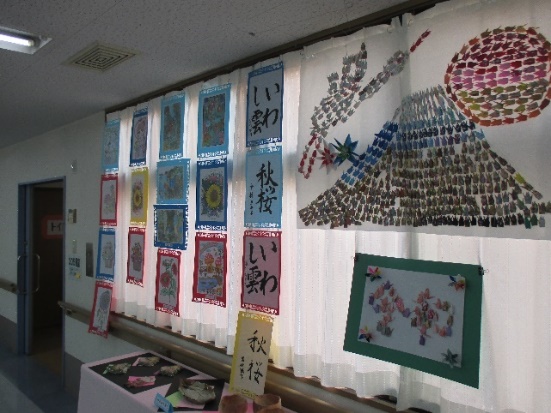 文化週間(作品展示) 習字や塗り絵、貼り絵の展示のほかにもおやつ作りなどを行っています。 |