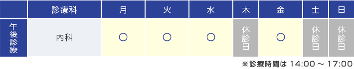 | 診療日 | 月・火・水・金 14:00 ~ 17:00 |