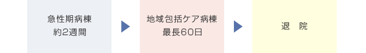 地域包括ケア病棟で医療やリハビリを受けることができる日数は最長で60日が原則となっています。その間に、ご自宅や介護施設で生活ができるよう目標を立て、プログラムを組みます。病棟には専従の社会福祉士やセラピスト等の専門スタッフがおり、多職種による退院に向けたサポート体制が整えられておりますのでご安心ください。