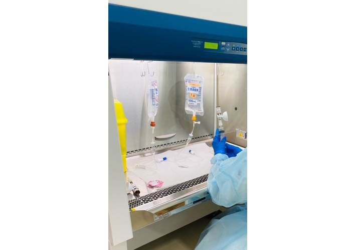 安全キャビネットを用いて抗がん剤の混合調整を行っています。